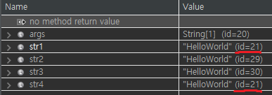 이클립스에서는 str1==str4로 결과값 출력과 같이 나오는데