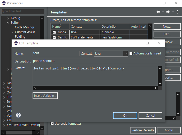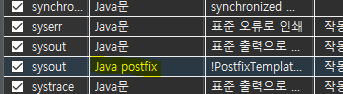 뭐가 문제인가 싶어 자세히 보니 sysout 템플릿은 Java postfix 컨텍스트까지 총 2개가 있다.