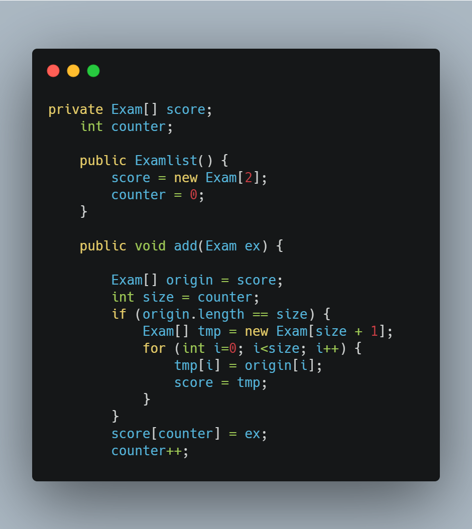 Exam[] tmp = new Exam[size + 1]; //비교값이 같으면 배열이 값으로 꽉찬상태. 배열길이+1의 임시배열 생성