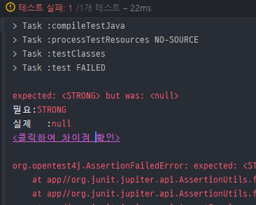 실행결과는 당연히 실패...여기서 테스트결과를 성공시키기 가장 단순한 방법으로 간다.